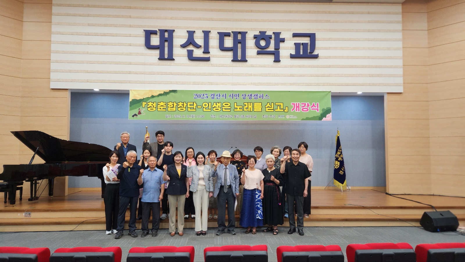 2025년 경산시 시민상생캠퍼스 「청춘합창단_인생은 노래를 싣고」 개강식1. 사 업 명 : 2025 시민상생캠퍼스 「청춘합창단_인생은 노래를 싣고」2. 교육기간 : 6월 10일(화) ~ 11월 25일(화) 14:00-16:00(일부 변경있음)3. 교육장소 : 대신대학교 본관 5층 세미나실4. 개강식 : 2025년 6월 10일 14:00