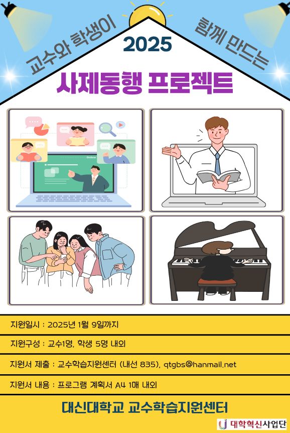 대신대학교 교수학습지원센터는 수업방법의 개선과 학생 성장 역량 강화에 도움을 드리고자 합니다. 수업방법을 개선하기 위한 워크숍, 수업컨설팅 및 교수연구회 프로그램이 있으며 학생 성장 역량 강화를 위한 워크숍, 학습공동체, 공모전 프로그램을 운영하고 있습니다. 가르침과 배움의 활동을 통한 교수·학습자의 역량 강화를 지원하고 있으니 많은 관심부탁드립니다.