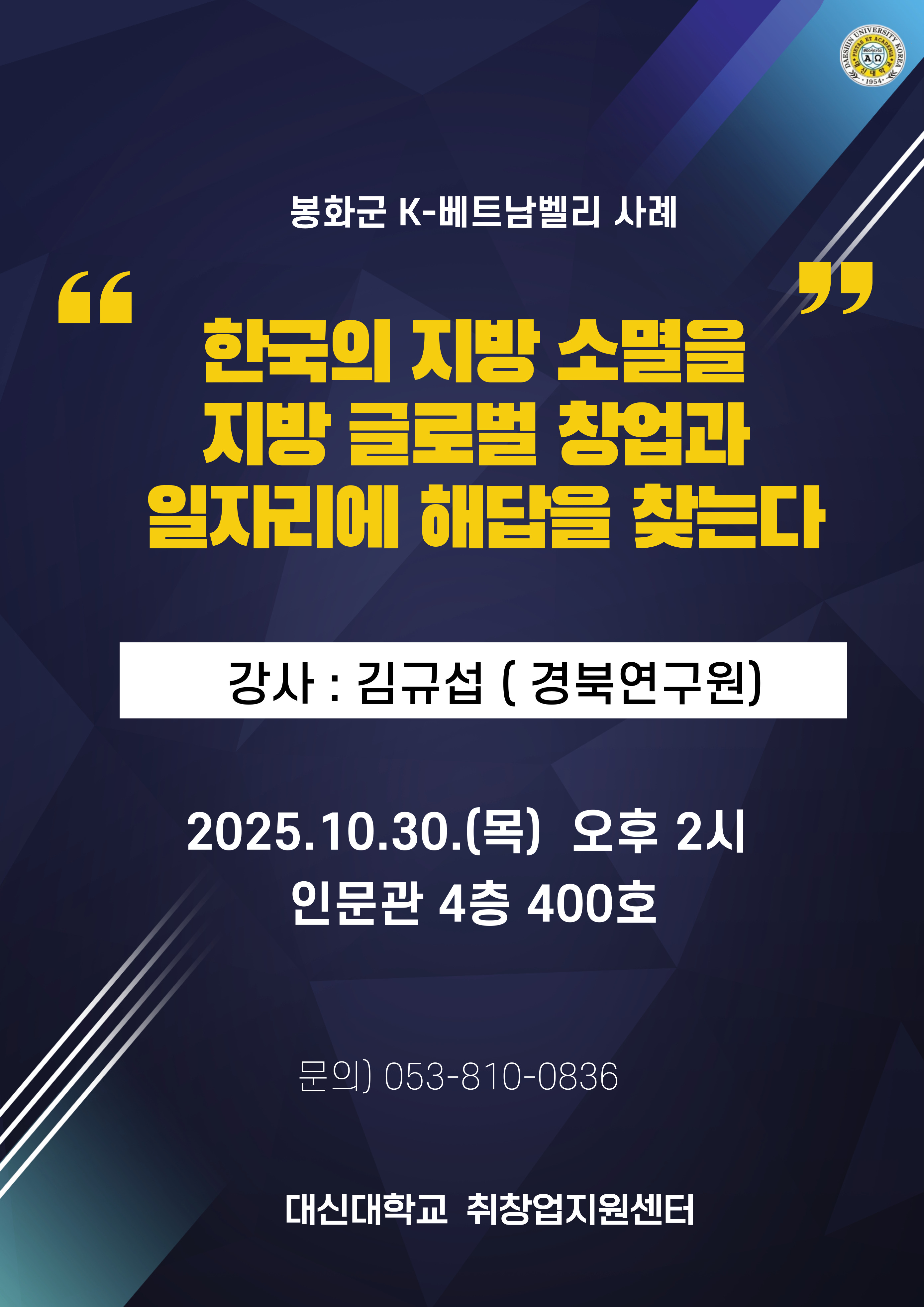 취 · 창업지원센터 / 특강 / '한국의 지방 소멸을 지방 글로벌 창업과 일자리에 해답을 찾는다.'