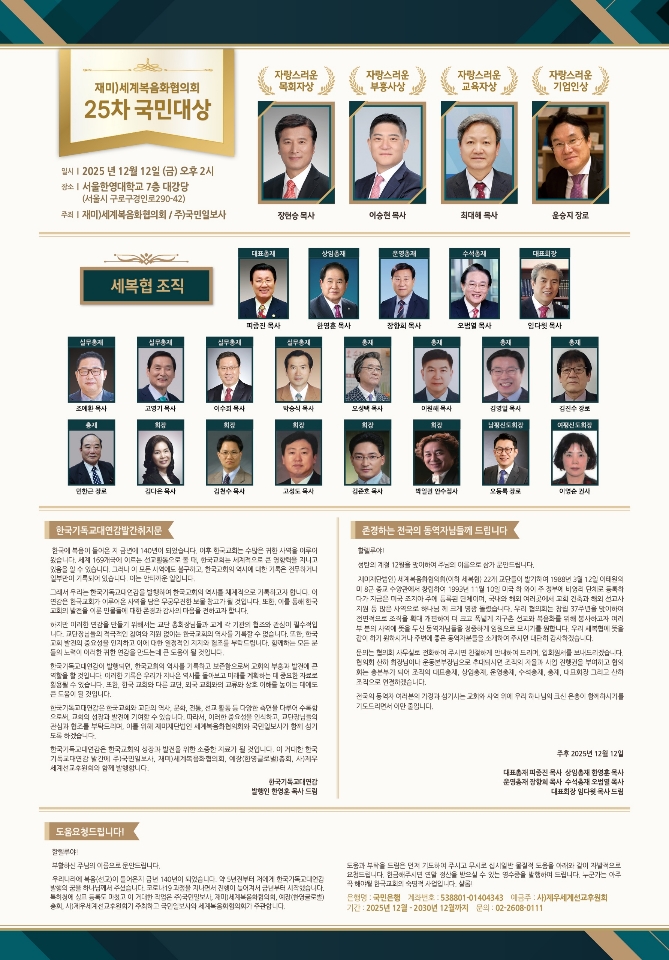 ◇ 시상분야: 7개 부문 ◇ 시상내용: 상패, 상금(각100만원) ◇ 수상자발표 및 시상: 국민일보 지면을 통해 공지 ◇ 시상식: 2025년 12월 12일(금) 오후 2시 ◇ 장소: 서울한영대학교 7층 대강당 ◇ 주관: 국민일보·세계복음화협의회