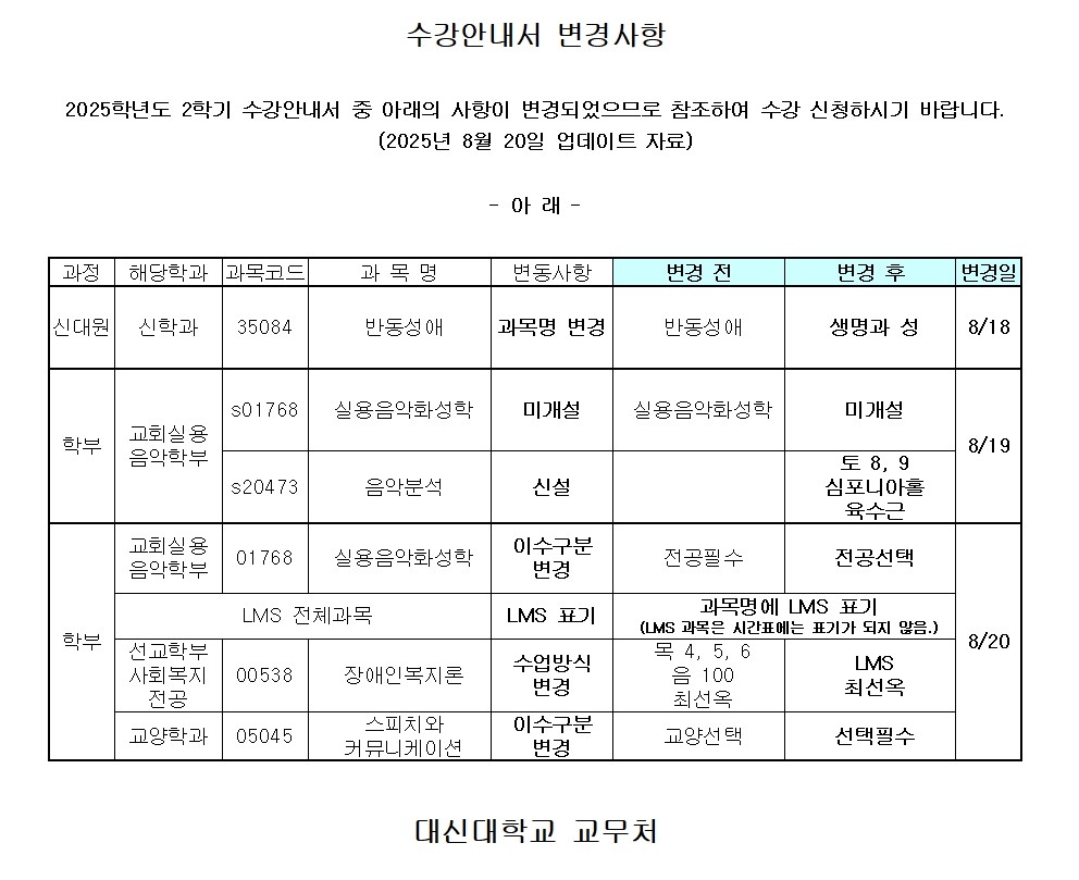 2025학년도 2학기 수강안내서 변경사항 안내(8/20)