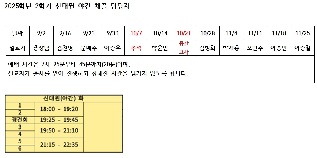 2025학년도 2학기 신대원(야간) 시간표 및 경건회 공지