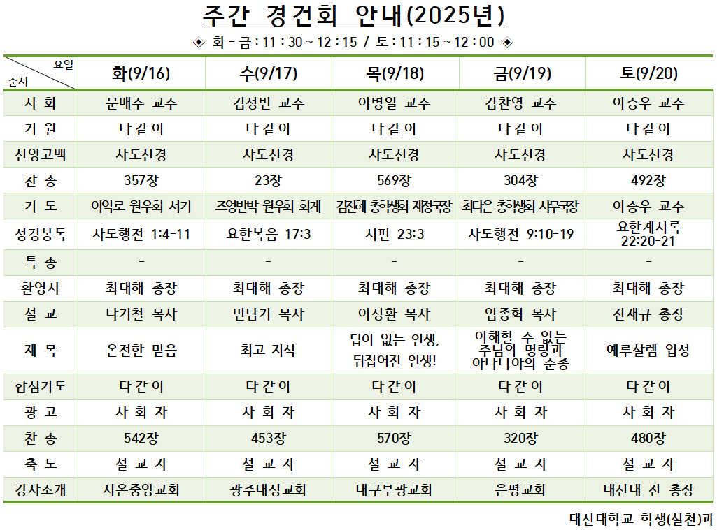 9월 3주차 (9월 16일 - 9월 20일) 경건회 안내