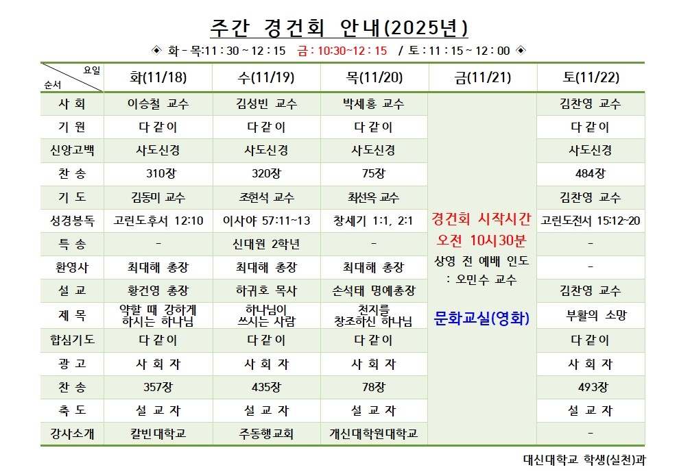 11월 3주차 (11월 11일 - 11월 15일) 경건회 안내