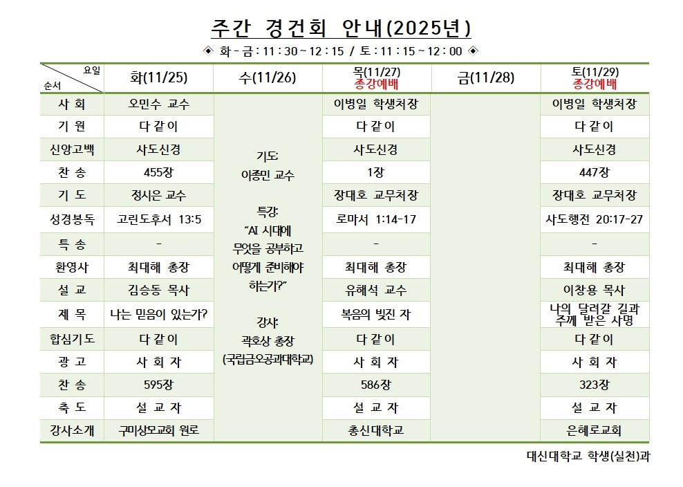 11월 5주차 (11월25일 - 11월29일) 경건회 안내