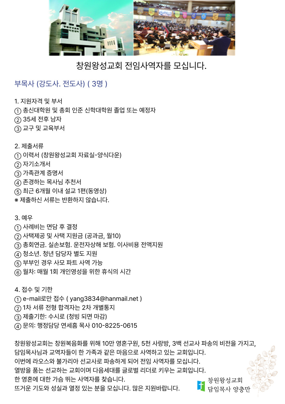창원왕성교회 전임사역자를 모십니다.
