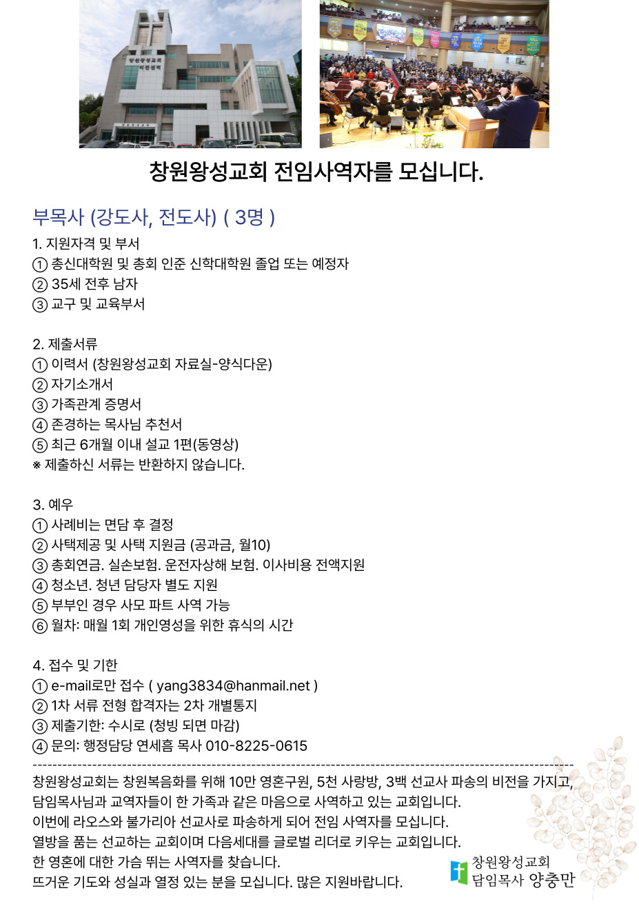 대구성명교회에서 동역자분들을 모십니다(전임2, 준 전임1)