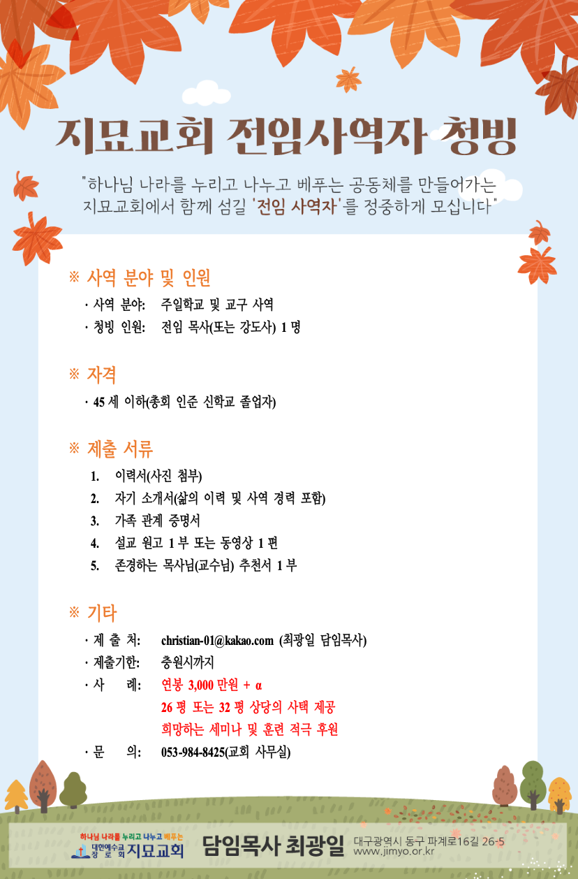 부산 동원교회에서 파트(목사, 전도사, 강도사님)을 모십니다.