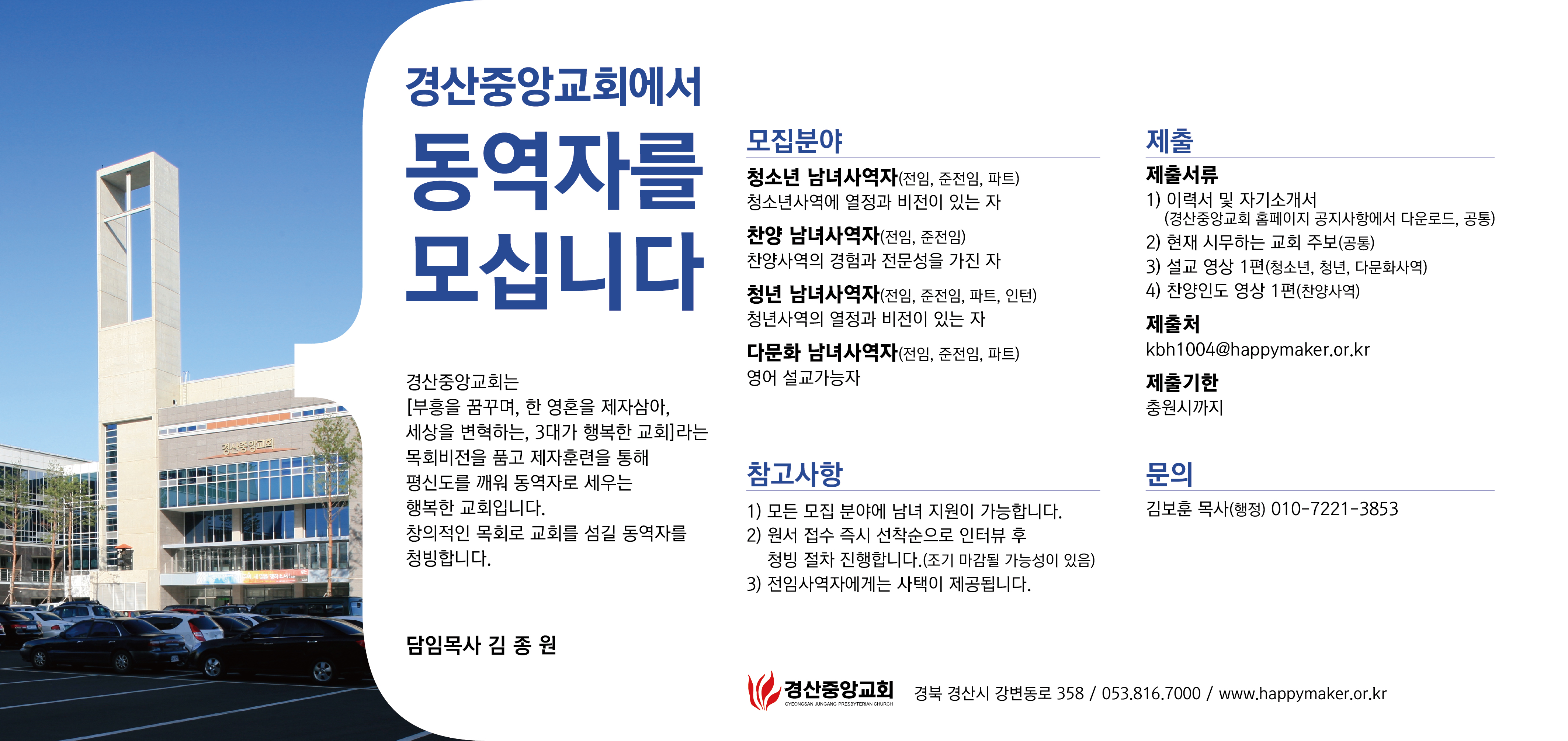 ![]() 경산중앙교회에서 동역자를 모십니다.