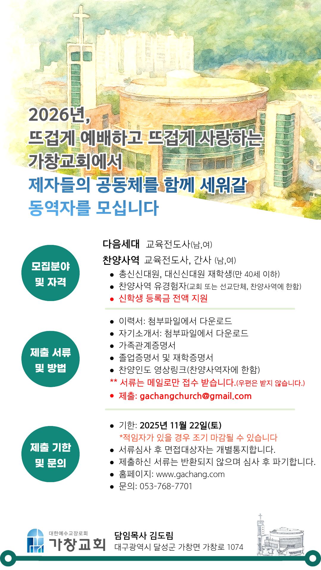 (끌어올림) 대구가창교회에서 파트사역자를 모십니다.