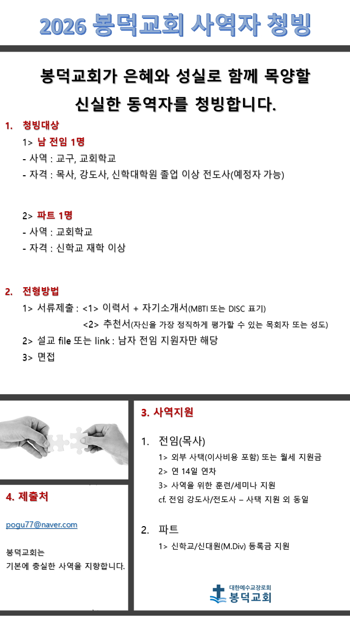 (부산)대동교회에서 교육부서 담당(전도사, 목사)님을 모십니다.