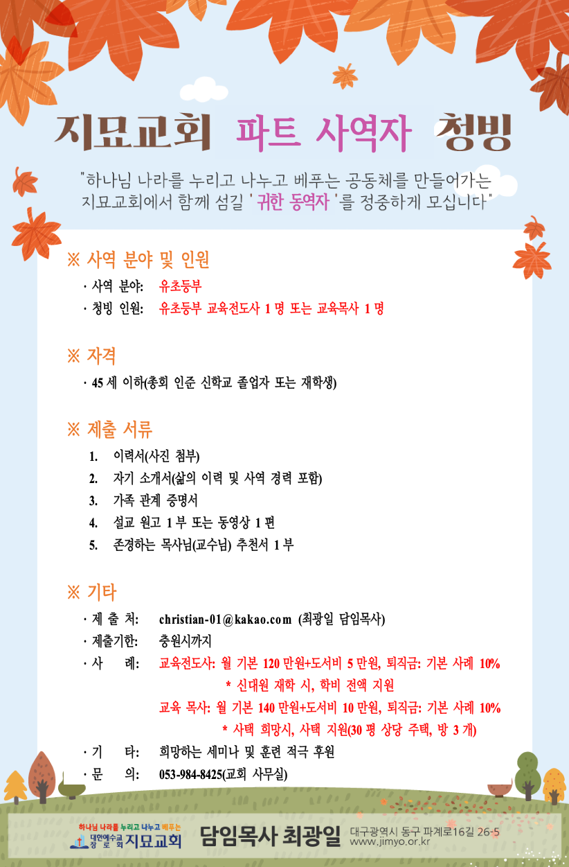 지묘교회에서 사역자를 초빙합니다. (교육파트 - 유초등부)