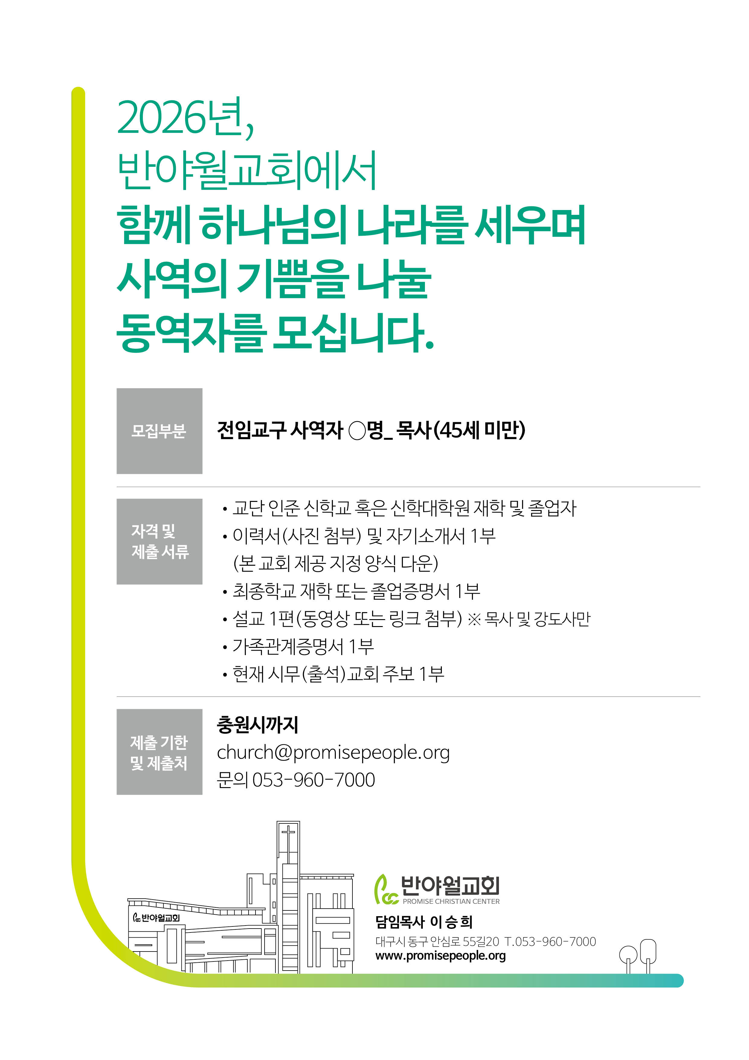 2026년 반야월교회와 함께할 동역자를 모십니다.