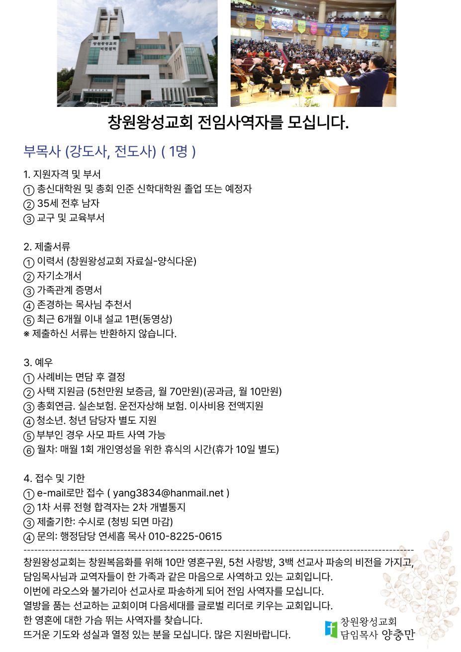 창원왕성교회 전임사역자를 모십니다.