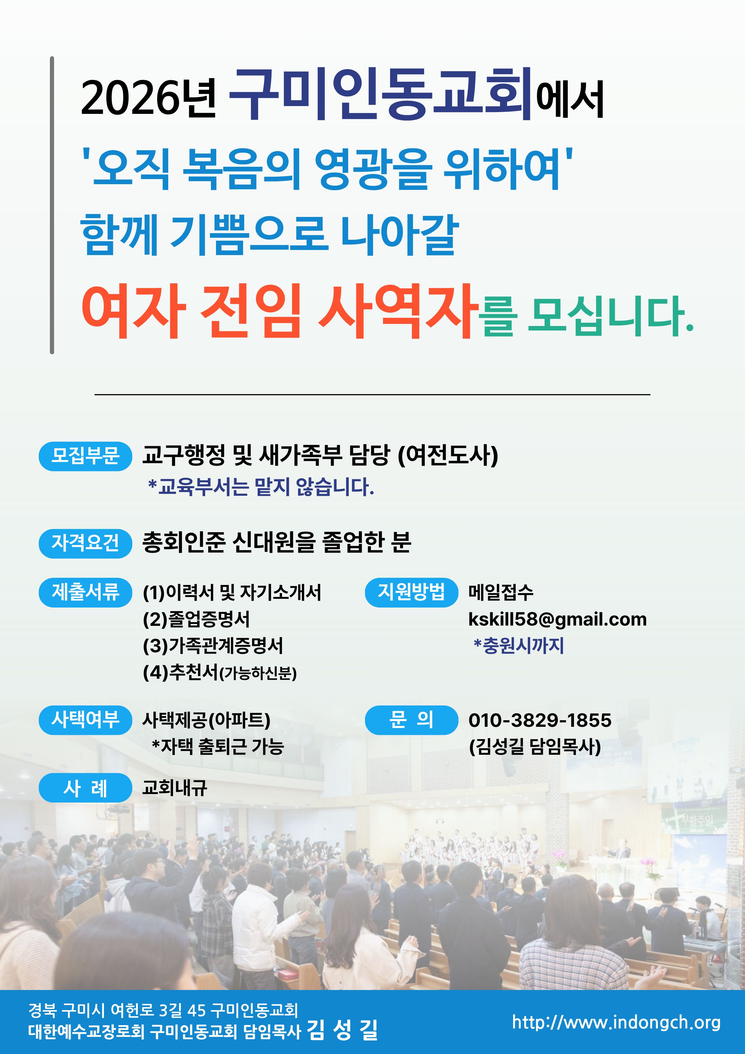 전임 여전도사 / 교구행정 및 새가족부 담당 ( 교육부서 제외)